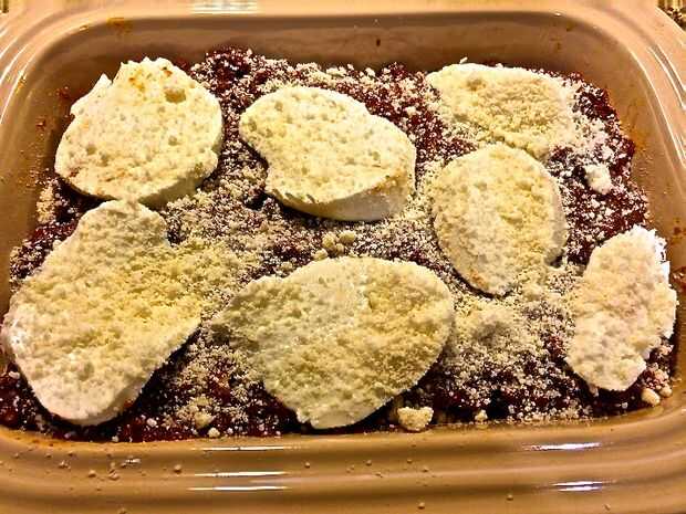 Coloque 1 a 2 tazas de pf la salsa sobre los fideos a la cazuela. Coloque rodajas de mozzarella y espolvorear con el parmesano reggiano.
