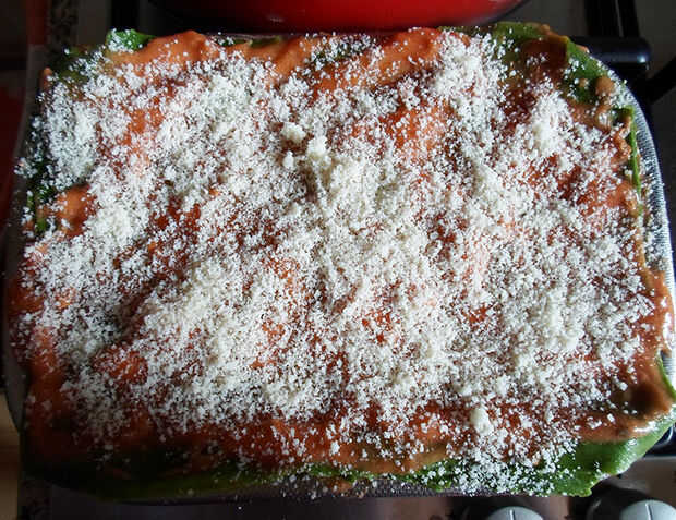 Añadir otro rectángulo de pasta y bechamel y salsa de carne y parmesano...