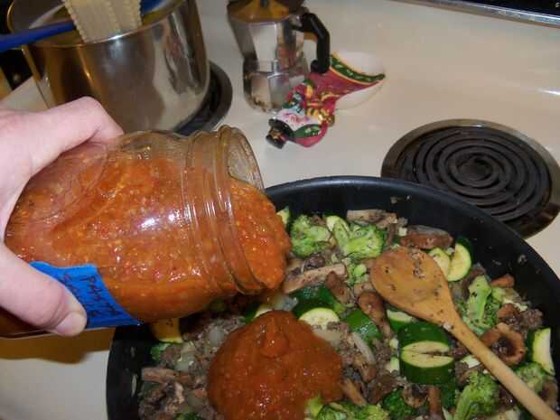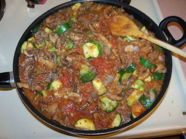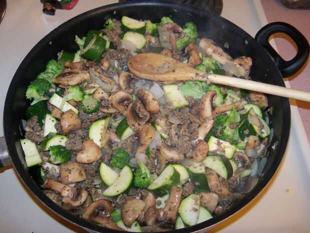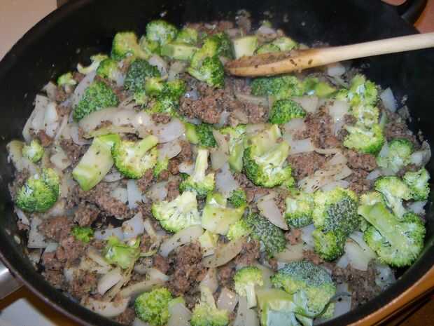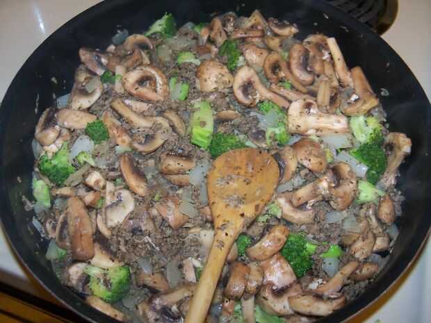 Una vez que la carne de vacuno ha sobre todo doradas, machacar el ajo en la sartén y añadir la cebolla. Cocina esto hasta que la cebolla empiece a conseguir un poco translúcido y agregar el brócoli. Cocinar por unos minutos, luego añadir los champiñones. Que vaya por un tiempo, dejando las setas y el brócoli suave y añadir el calabacín. Como mi calabacín un poco crujiente, así que sólo lo cocino hasta que se pone caliente, luego agregar la salsa. Poner todo a hervir, dejarlo cocer a fuego lento durante unos minutos, luego apagar el fuego.