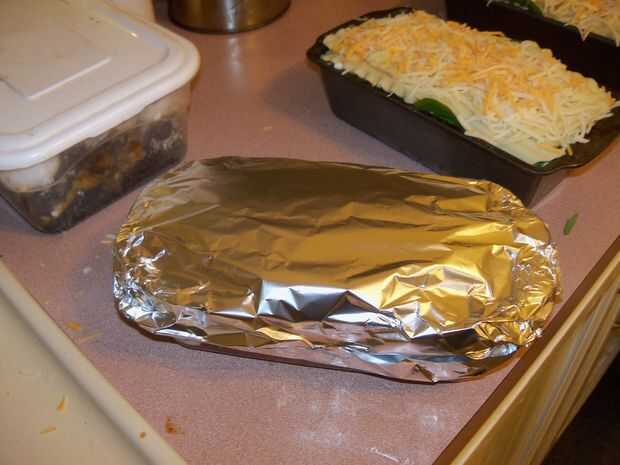 Al cocinar, gire el horno a 350 grados y poner la lasaña en allí con el papel aluminio en su lugar. Comprobar después de unos 45 minutos, y luego otra vez cada 10 minutos hasta que el medio centro es agradable y caliente. Retirar en ese momento el papel de aluminio y cocinar por 10 minutos más, dejando el queso marrón. Sacar del horno y dejarlo durante 10-15 minutos, luego cortar y servir con una rodaja de pan de ajo!