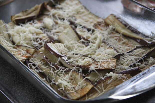 Luego agregar una capa de láminas de pasta, luego las berenjenas y dos salsas.