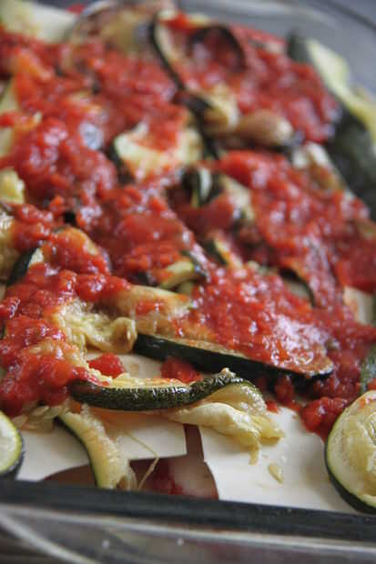 Añadir otra capa de láminas de pasta, luego el calabacín y las salsas otra vez. Sazone bien las capas.
