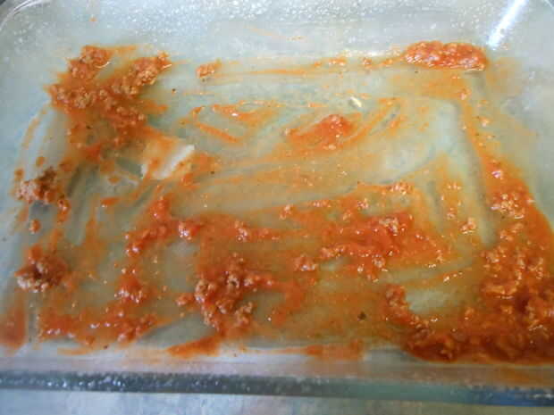 Lugar un poco de la salsa de carne en la parte inferior de la cacerola.