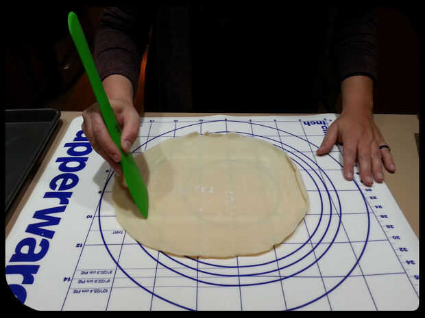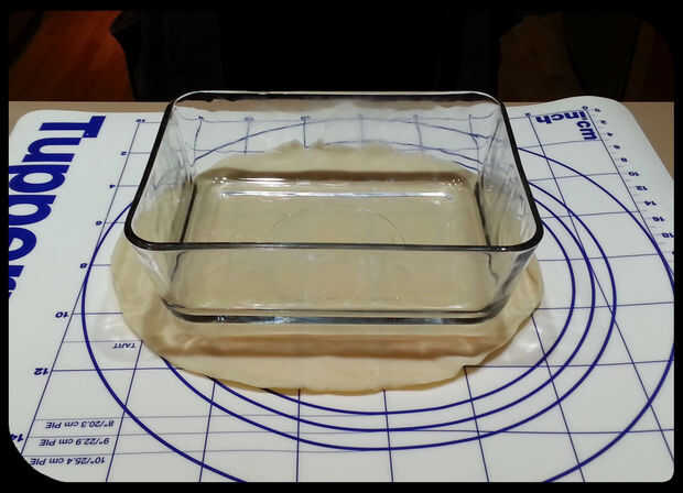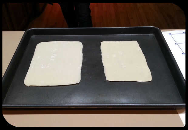 Prepara con antelación las dos cajas de pudín instantáneo y almacenar por separado. Rodillo hacia fuera la base de la tarta, luego, utilizando el envase de cristal como guía, cortar rectángulos de masa, que servirá como los fideos de lasaña. En los cuadros, los rectángulos se cortaron un poco pequeños, así que asegúrese de agregar aproximadamente una pulgada todo el camino alrededor de los bordes del recipiente de contracción. Coloque los pedazos de corteza en una bandeja de horno y hornear según las instrucciones. Para nuestros nos los horno a 450 grados Fahrenheit durante diez minutos.
