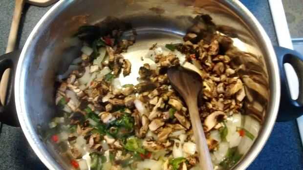 En una olla poner en las cebollas picadas con un poco de aceite y cocinar a fuego medio hasta que las cebollas comiencen a girar translúcida, Añadir entonces los pimientos. Cuando las cebollas estén completamente transparentes, añadir los champiñones. Revuelva y cocine hasta que las setas han miró para cocinar abajo.