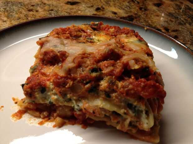 Hervir los fideos de lasaña según las instrucciones del envase. Escurra los fideos y los ponen en una hoja de galleta Spray antiadherente cocinar el pavo y mezclar los quesos.