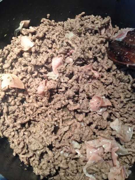 Marrón de la carne picada en una cacerola grande, según el contenido de grasa de la carne, puede o puede no necesitar un poco de aceite.