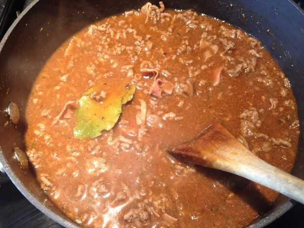 Añadir caldo de carne, salsa de tomate, nuez moscada, laurel y orégano.