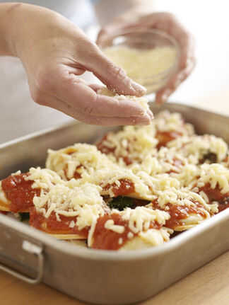 Tapa con otra capa de ravioles y la salsa restantes (no todos los raviolis se pueden necesitar). Espolvorear con el parmesano.