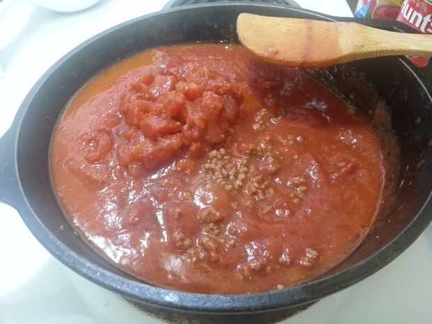 Añadir a la carne de vacuno las latas de salsa de tomate y tomates en cuadritos (desagüe).