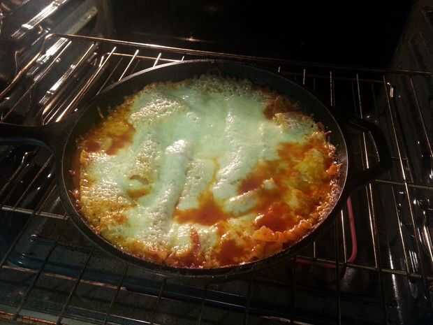 Lugar había cubierto de olla en el horno a 450 durante 30 minutos, luego retire la cubierta durante 15 minutos. Reducir el tiempo al descubierto para reducir el crujiente de queso-ness.