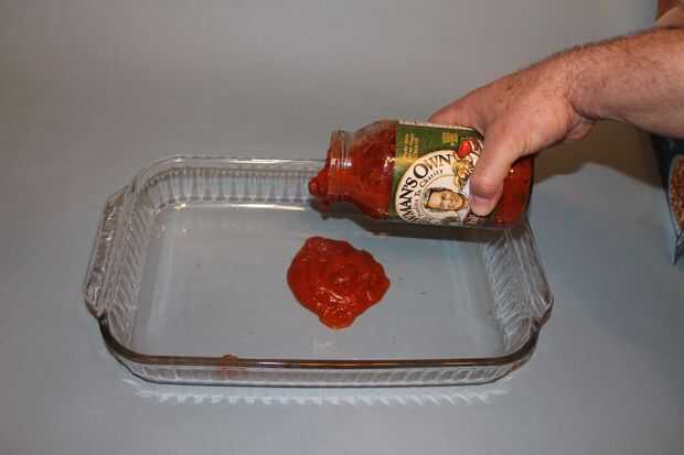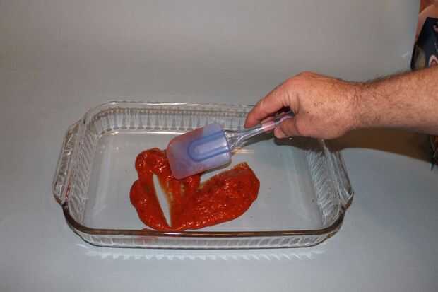Vierta aproximadamente 1/2 de la primera jarra de salsa para Pasta en la bandeja para hornear y extenderlo uniformemente hacia fuera algo.