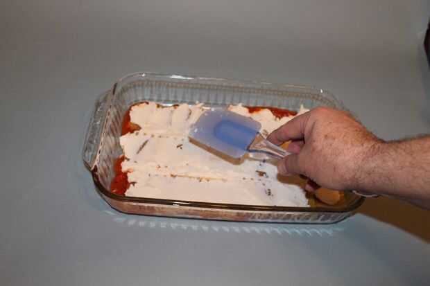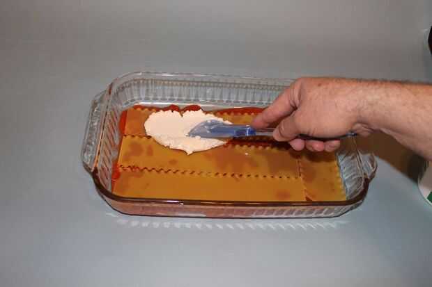 Queso ricotta es un queso para untar. Difundirlo en los fideos de lasaña. Esto se puede lograr mejor antes de poner los tallarines a la salsa (perdón por el aviso tardío). Probé ambos métodos, sobre fideos en salsa y sosteniendo los fideos con la mano y que se separa el requesón antes de colocarlas sobre la salsa. Tengo que decir que el método manual es un poco más fácil.