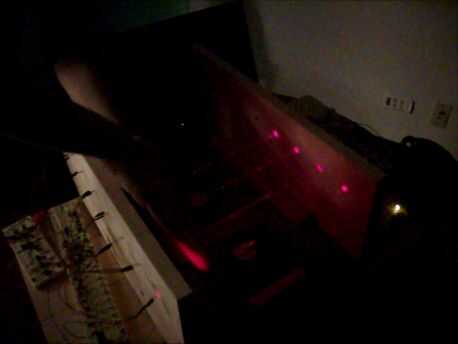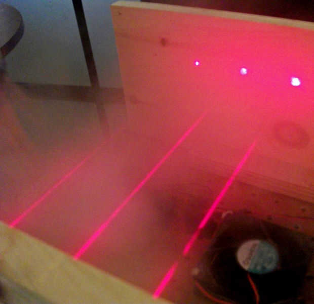 Ver una demo aquí: http://www.youtube.com/watch?v=2jXdVuBmwm4. (En caso de que te estás preguntando, el sonido de palmas en el video es alguien aplaudiendo dos borradores de pizarra para lanzar polvo de tiza en la caja. El polvo de tiza ilumina los senderos de rayo láser. Hay también alguna música de fondo jugando todo el tiempo a través de los altavoces).