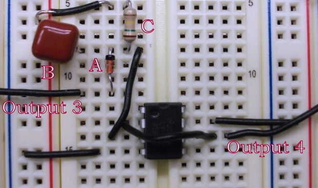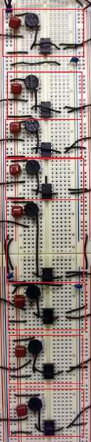 Vamos a construir la etapa de detección de pico. Es sobre el esquema y el diseño. Una vez más, comience en la parte superior de una placa nueva para construir el primer circuito y trabajar su camino hasta una segunda placa para construir los otros siete. Tenga cuidado al colocar el diodo A en cada circuito, es direccional. Puede decir la dirección señalando la banda negra en un extremo.