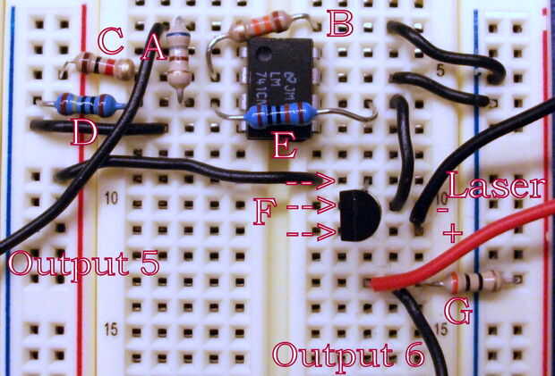 Otra vez, conecte los lados izquierdos de estas dos breadboards a los lados del derecho de las breadboards de detección de pico, cableado de las salidas a entradas. Tenga cuidado al conectar los carriles de la energía entre los dos pares de breadboards, sin embargo. Recuerda que son diferentes! También, conecte todos los nodos etiquetados salida 6 entre todos los ocho circuitos entre sí. El bloque de detección de juego utilizará salida 6 como una de sus entradas.