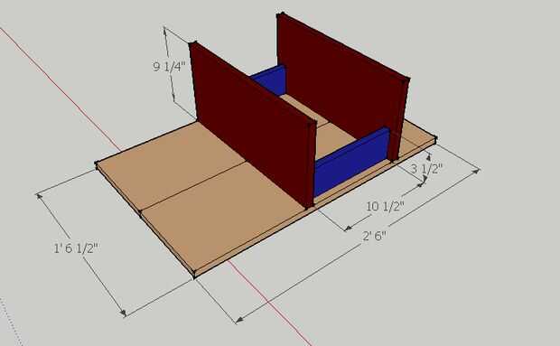 1. cortar o 1 "x 10" acciones o 1/2" madera contrachapada en las siguientes dimensiones ilustradas (tan, rojo y azules placas de color en el dibujo). El diseño está optimizado para 1 "x 10", pero no dude en cambiar las dimensiones para adaptarse a diferentes acciones. Usted debe cortar dos 3/4 "x 9 1/4" x 2.5 "(tan) tablas, dos 3/4" x 9 1/4 "x 1' 6 1/2" (rojo) tableros y dos 3/4 "x 3 1/2" x 10 1/2"(azul) placas.