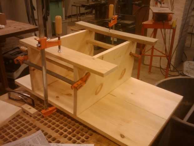 4. galleta unen las piezas rojas para las piezas tan (véase los cuadros segundo y terceros). Empotrar los tableros mientras que el pegamento de madera está mojado.