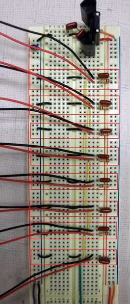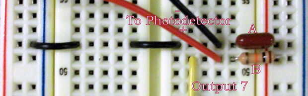Es el esquema y el diseño de la circuitería del fotodetector. Salida 7 en el esquema es un voltaje alto o bajo dependiendo de si o no el fotodetector Ve el láser. Los circuitos de control usará esta información para determinar si un jugador ha jugado notas correctamente. Continuando en la misma placa debajo del circuito 7805, coloque todos los ocho circuitos de célula fotoeléctrica. El resultado final debería verse como la última imagen de arriba. Nota que todos los nodos etiquetados "salida 7" están conectados juntos. Se trata de una de las entradas en los circuitos de control que construiremos a continuación.