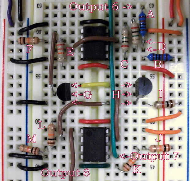 En la placa misma que se utilizó para diseñar la circuitería del fotodetector o en un protoboard nueva debajo de la otra, diseñar los circuitos de control. Tenga en cuenta que sólo tienes que presentar una copia. Salida 6 es la salida del circuito comparador en el bloque de detección de la nota (paso 11) y se conecta a la fila en la protoboard que se muestra. Salida 7 es la salida de los circuitos del fotodetector y el cable verde que se muestra.