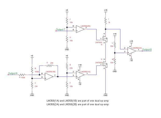 Ahora vamos a construir los circuitos de control. Es sobre el esquema y el diseño. Los circuitos de control analiza la corriente consumida por los láseres y fotodetectores (más precisamente, la tensión cayó a través de resistencias en serie con el láser y los detectores). Si los láseres son dibujo actual, significa que al menos uno de ellos es el. Si los detectores son dibujo actual, eso significa por lo menos uno de ellos es ver un láser (y así no se bloquea al menos un laser). La única manera en la que el jugador puede jugar las notas correctamente si es por lo menos un láser en (los láseres son dibujo actuales) y se bloquean todos los rayos láser (los fotodetectores no son dibujo actual). Los circuitos de control busca esta condición y salidas de alto voltaje si se cumple esta condición; de lo contrario salidas baja tensión. Este voltaje se alimenta en el bloque de interruptores y controles si o no esté la música de entrada para ser jugado por el orador.