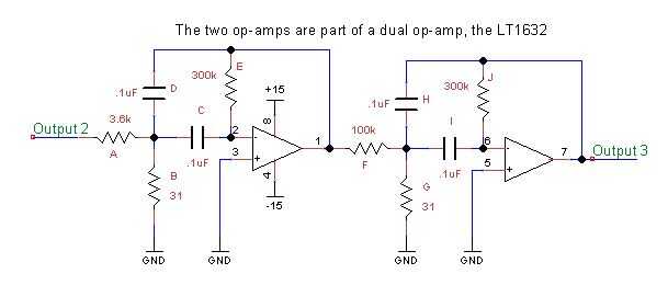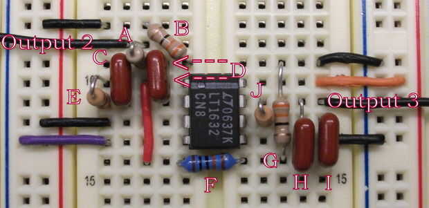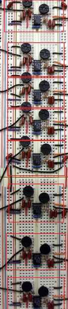 A partir de la parte superior de una placa nueva, construir los filtros de paso de banda según el cuadro de esquema y el diseño. Trabajo su camino hasta construir siete más, necesita dos breadboards. Para el último filtro bandpass, use un resistor de k 10 para resistencia A en lugar de una k de 3,6 uno. (Técnicamente, esto es ya el octavo canal incluye un multiplicador, que atenúa la señal).
