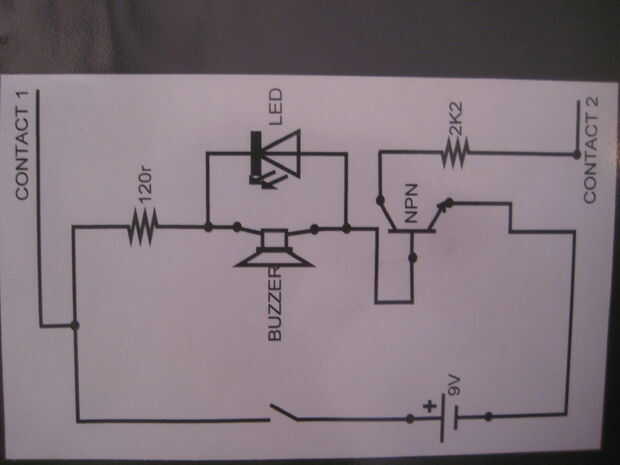 Quería que mi alarma encendida incluso cuando el láser se ha restablecido a la LDR, y esto es lo que he hecho. Su funcionamiento es el transistor (no sé de qué tipo, creo que NPN, pros ayudan me por favor) mantiene el circuito abierto. Una vez contactos de uno y dos (consulte el diagrama para entender qué Im hablando sobre) hacen contacto activará el transistor para permitir el flujo de corriente pasar, este flujo de corriente a su vez mantiene el transistor abierto, lo que significa no cerrará el circuito (mantener la alarma en) hasta que alguien físicamente mueve un interruptor para reiniciar/apagarlo.