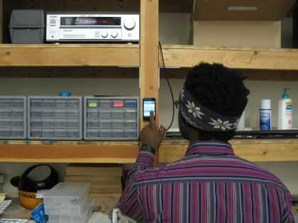 Apenas nos hemos movido en un nuevo espacio, y una de las primeras cosas que hice fue instalar el estéreo de Brad en el espacio de la tienda. Música proviene de cualquiera computadora o desde un iPod touch, o airtunes. El problema es cuando queremos hacer una pausa, cambio de volumen o pistas, uno de nosotros tiene que dejar lo que estamos haciendo, caminar a la radio (o laptop) y jugar con él. Usando un control remoto tradicional, no funcionará porque usted todavía tiene que encontrar. Llegamos a pensar: ¿no sería agradable si sólo pudiéramos onda nuestras manos y controlar la música desde donde estamos? La idea es arrojar un haz de luz láser a través del cuarto en el sensor de luz de schemer; Si esa viga se rompe (por una mano levantada), schemer reacciona y le dice a la base de la magia, que dice el iPod. Puesto que hay solamente un haz de luz (por ahora), tuvimos que modificar el "vocabulario que agita" para nuestros 3 funciones más comunes:-una vez la onda para pausa/reproducir. -Onda dos veces para llegar a la pista siguiente. -Mantenga la mano hasta que se selecciona la pista anterior.