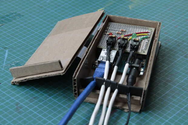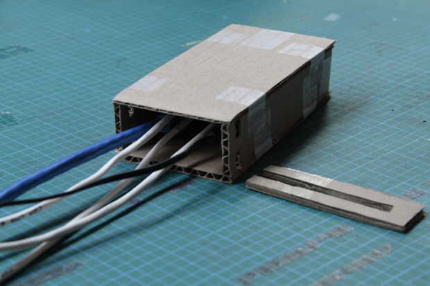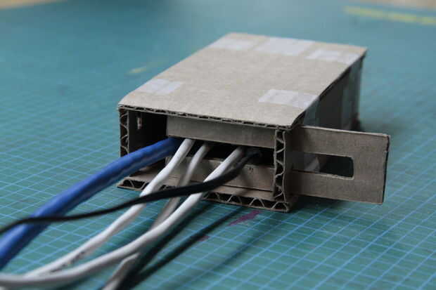 Para bloquear el lado abierto del recinto que cuenta con todos los cables de salida, hemos diseñado una 'bloqueo' en la puerta que puede rajar en el recinto desde el exterior y forma un muro de cierre con un camino estrecho en el medio de los cables. (A la intemperie la apertura que existe vamos a añadir una capa de goma con recortes exactos más adelante en el paso 7!)