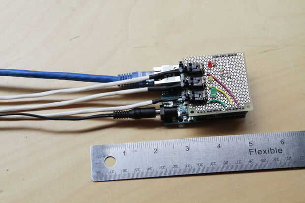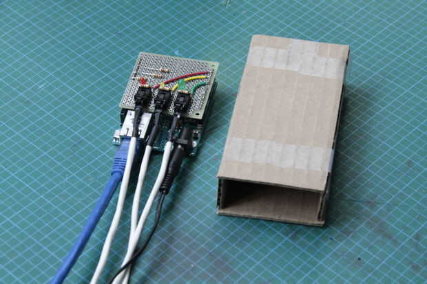 El primer problema a resolver: ¿Cómo vas a abrir tu gabinete? En vez de dar a la caja una tapa, como se muestra en la imagen de arriba, que optaron por dejar sólo una abertura en el lado más corto. Permite deslizar el Arduino en de ese lado y deja todos los paneles y bordes a ser permanentemente cerrada y por lo tanto resistente al agua.
