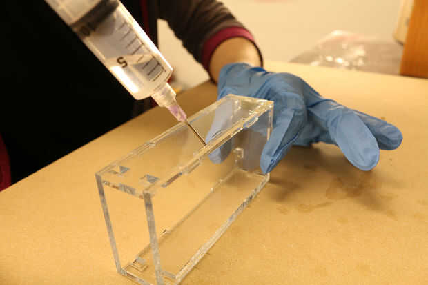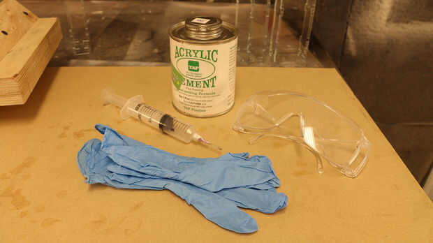 Acrílico se puede pegar con cemento acrílico, que es un solvente que en realidad se derrite y químicamente las superficies acrílicas bonos entre sí: por lo tanto nombre "soldadura química"! Se utilizó Cemento de acrílico del grifo. Para aplicarlo necesitarás un apropiado aplicador (biberón o jeringa), unas gafas de seguridad y guantes de látex desechables .