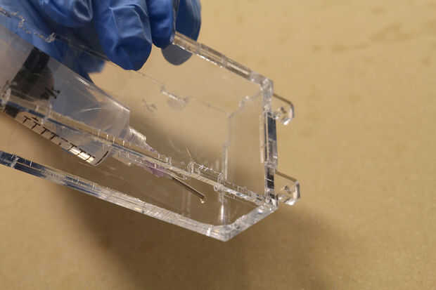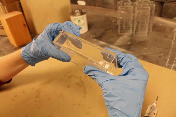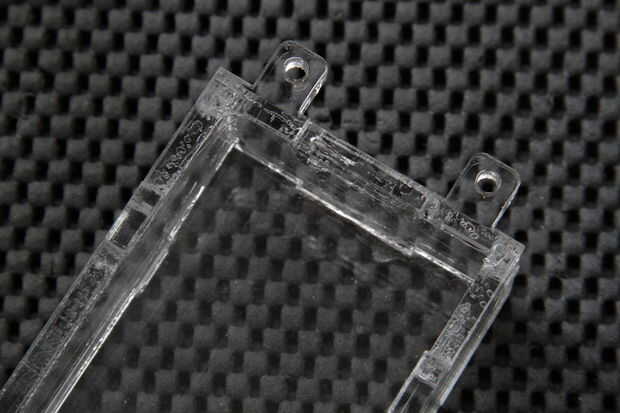 El acrílico transparente lo hace al mismo tiempo fácil y difícil de controlar la propagación del pegamento entre las superficies. Tendrá buena iluminación para ver fluidas y poco las burbujas que aparecen entre las capas de acrílico. Incluso nos perdimos algunos no alineaciones de muescas, porque es tan difícil ver esos bordes transparentes!