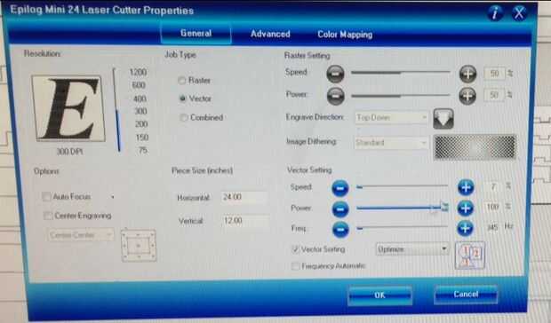 - Cargar archivo y configurar las preferencias de impresión. De esta madera que terminó ajuste velocidad: 12%, energía: 100%, frecuencia: 400Hz. Usted encontrará que cada pieza de madera es diferente, por lo que recomiendo hacer una prueba de corte en caso.