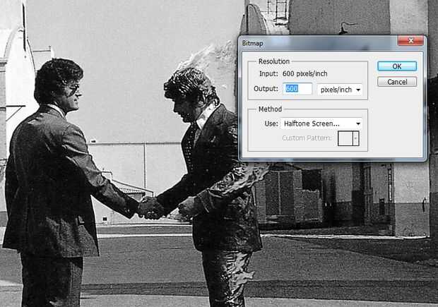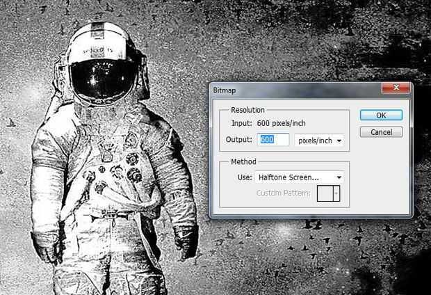 Introduzca un valor para el campo "Output". Este es el paso donde se debe utilizar el valor de volver a muestrear del paso 3. El valor de salida debe ser igual al valor de entrada (ambos son 600 píxeles/in en mi caso). El método utilizado debe ser de trama de semitonos. Seleccione "OK"