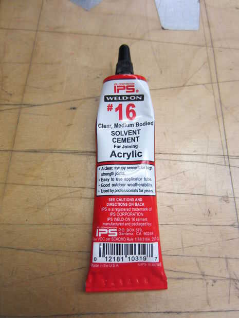 • Cemento acrílico como IPS Weldon-On #16.  Disponible en las tiendas de plásticos.