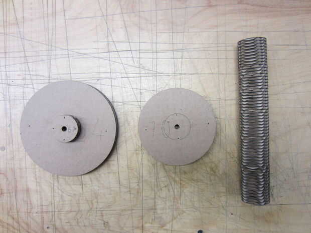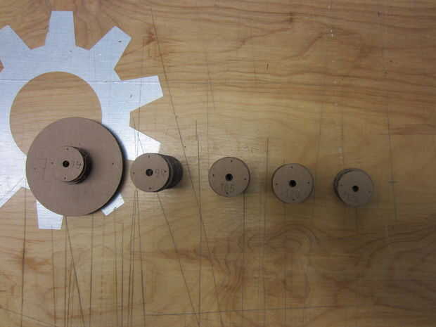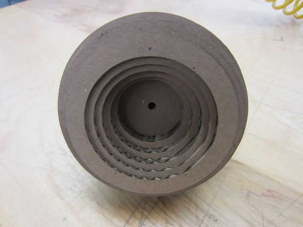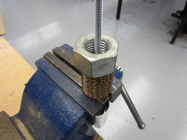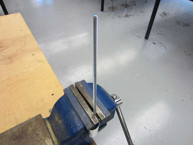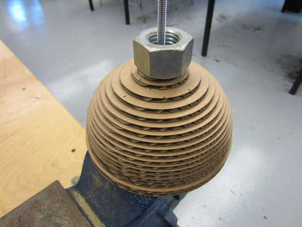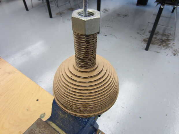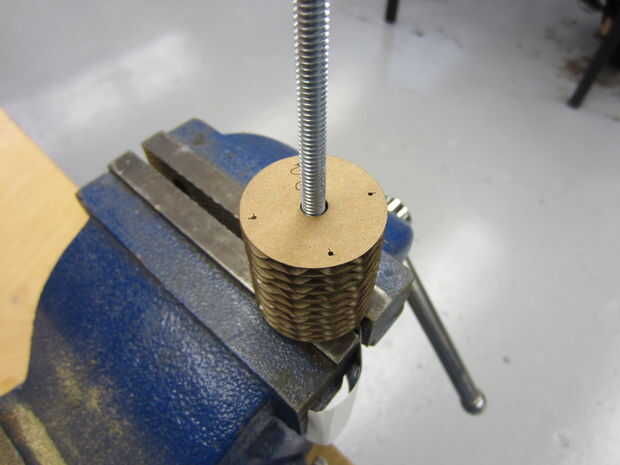 4. Poner la varilla en un tornillo de banco y me resbaló con cuidado cada parte en orden a la varilla con cola blanca en el medio.  Encontré que obtuve los mejores resultados haciendo unos seis rebanadas a la vez y esperar que el pegamento sostener antes de hacer el siguiente grupo de rebanadas.  Utilicé las arandelas y tuercas pesadas para presionar a las partes mientras se secaba el pegamento (los ejemplos se muestran en las fotos de sexto a décimo).
