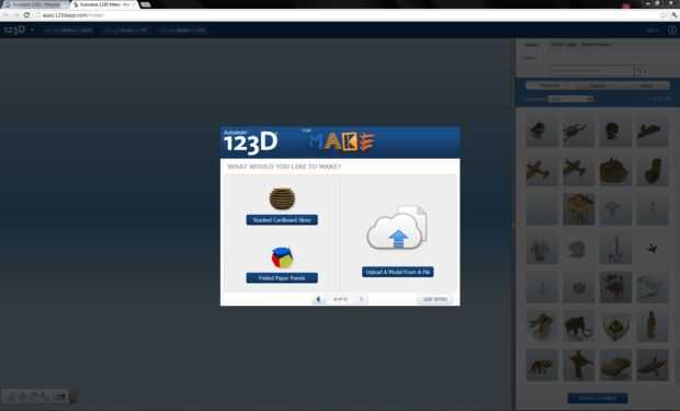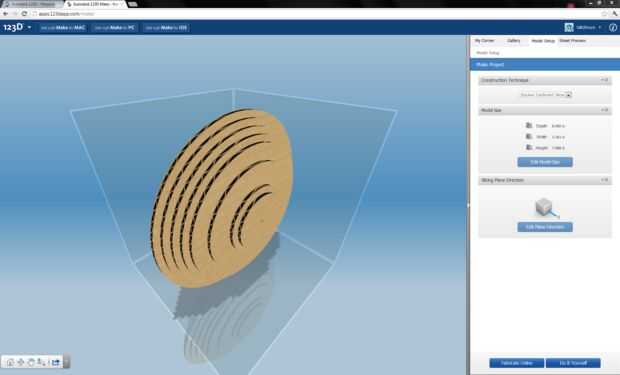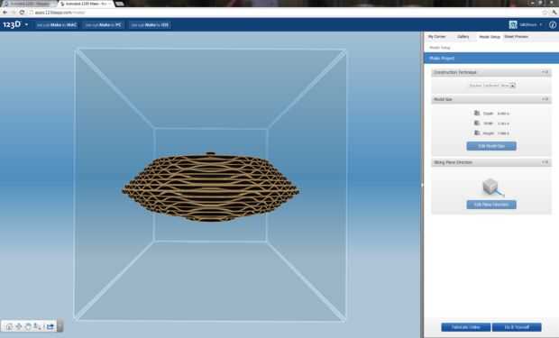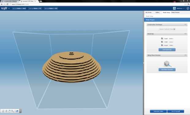 El siguiente paso es hacer 123D en un navegador y cargar el archivo de modelo STL creado en el paso anterior. Una vez cargado, Make 123D Rebane el modelo. Cuando se carga el modelo, las rebanadas no fueron en el sentido que quería: tenía que cambiar el eje de las diapositivas para que no fueran hacia los lados (capturas de pantalla del segundo al cuarto) sino horizontal (quinta captura de pantalla). En el sexto al octavo imágenes se muestran varias vistas del modelo en rodajas.