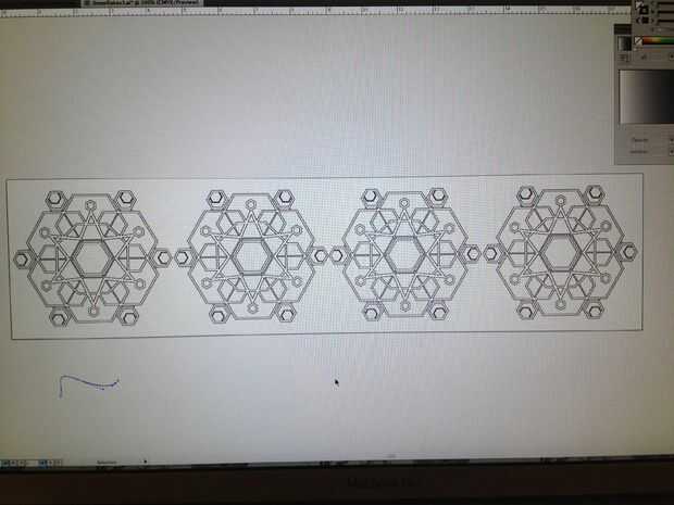 Utiliza Adobe Illustrator para dibujar mi copo de nieve, pero usted puede hacer esto con cualquier software de dibujo mientras el archivo se convierte a un tipo que reconocerá su láser.  Usted puede dibujar estas maneras 1 millón pero hice dibujando formas simples y luego disponerlos simétricamente.  Para obtener los contornos para el láser simplemente aumentó el peso de la línea de mis líneas de copo de nieve y combina en forma única usando a 'Pathfinder'.  Entonces usé 'Outline Stroke' debajo de 'Ruta' en la gota de 'Objeto' menú.