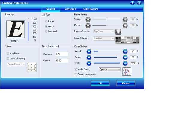 3. en las preferencias de impresión configuración de vector. He usado velocidad 90 18 / energía / frecuencia 5000. Haga clic en imprimir
