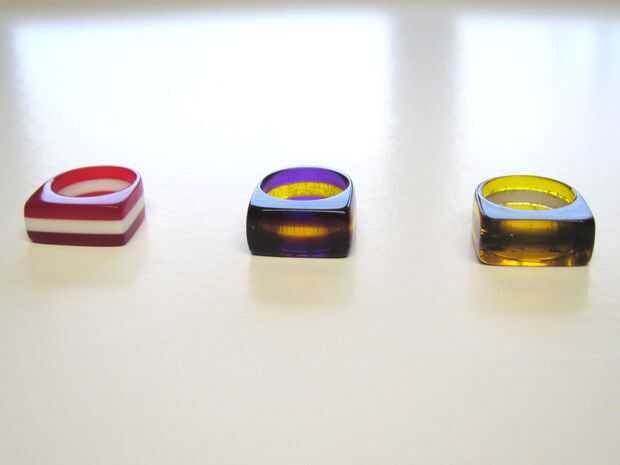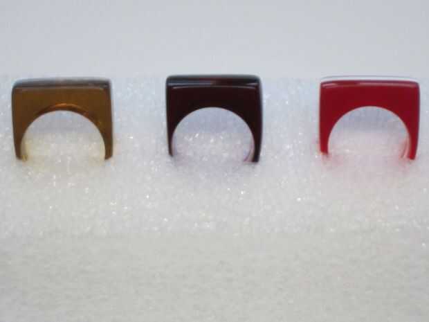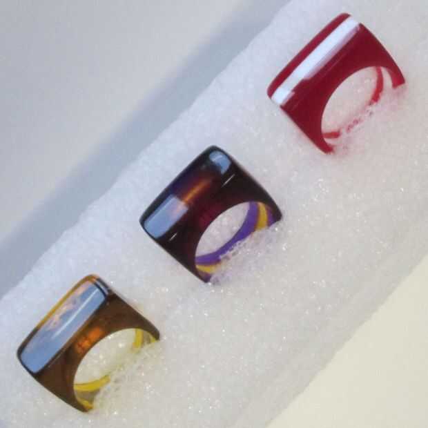 Obviamente se elige la combinación de colores para el gusto del destinatario. Encontrar el mejor efecto se alcanza con colores transparentes (aquí el ámbar, marrón y violeta) y colores translúcidos (como el rojo aquí). Pero colores opacos (blanco, negro) dan resultados agradables también. Las fotos en los siguientes pasos son de la fabricación de un anillo negro y rojo que no se muestra en fotos anteriores.