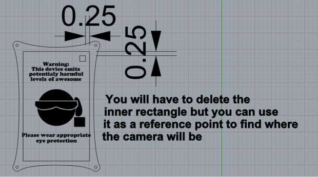 Ahora que el contorno que desea con los cuatro agujeros para los pernos, usted puede copiar y pegar ese conjunto al lado y entonces puede empezar a trabajar en lo que será la base. Para hacer la base de su voluntad tiene que borrar el rectángulo interior dejando los orificios para los tornillos de cuatro y el contorno intacto. A continuación deberás hacer y coloque una escuadra que es un poco más grande que la cámara dentro del contorno de la placa base donde la cámara será cuando el dispositivo está en su caso. Para obtener la ubicación exacta tendrá que medir encima de la tapa y f Rom al lado para que lo coloca perfectamente (ver imagen).