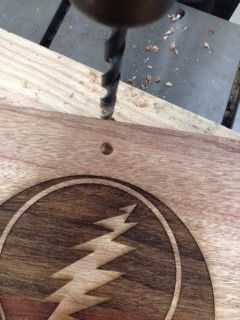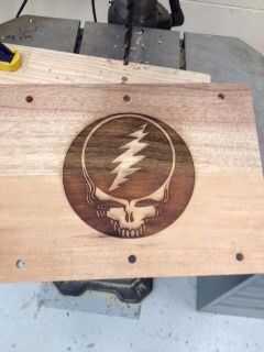 Después he probado mi diseño y mi consejo fue ajustado y listo para entrar, grabado en mi diseño. En el grabador, configurar su placa en el lugar adecuado y establecer el láser en el centro del tablero. Marque suavemente el centro del tablero con un lápiz y luego puede mover el punto del laser con las teclas de flecha en su teclado. En el programa de láseres, cambie la configuración para adaptarse a los materiales que utilizó y luego puede empezar a grabado. En la mía, usé 1/2" espesor madera de caoba. Este diseño del grabado me llevó unos 20 minutos. Una vez que fue terminado grabado, usa el taladro para cortar mis seis agujeros para mi LED. El láser de marcado exactamente donde yo tenía que para perforar por lo que este había guardado mucho tiempo en lugar de marcar hacia fuera. Usando una broca de 27/64" bits, perforé mis agujeros hacia fuera para el LED de 10mm y encajan perfectamente.