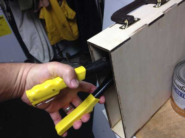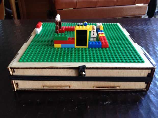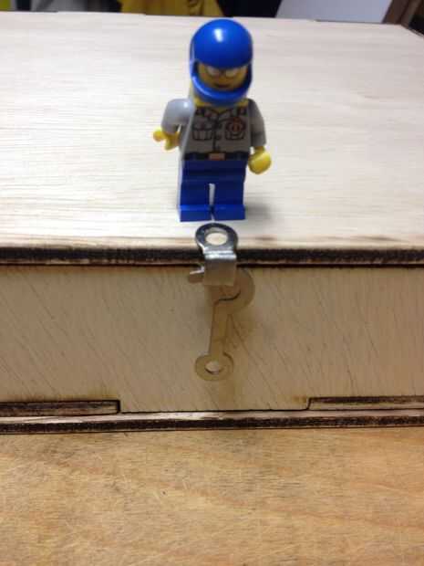 2. mecanismo de cierre: intenté una traba, pero Lego Cop dijo no iba a funcionar bien. Entonces usé elástico de 1/2" y algunas tachuelas de tapicería antigua para hacer a un cajón de extracción y una banda de cierre que impide el deslizamiento hacia fuera el cajón.
