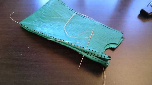 Comience en la parte inferior, serpiente su manera los agujeros hasta que golpeó la parte superior, luego la serpiente hacia abajo otra vez. Hacer algunos bucles en los dos últimos agujeros para fijar hacia abajo y empuje el extremo suelto de la manga.