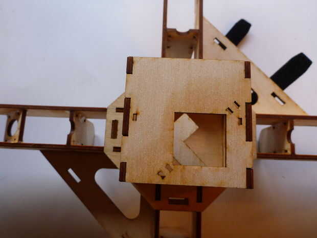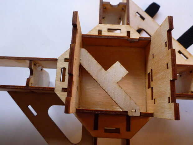 10. a continuación, montar la plataforma electrónica sobre la pieza superior como se muestra sin pegar nada todavía. Preste especial atención a la alineación de las piezas. Instale el travesaño diagonal como se muestra. Cuando las piezas están correctamente instaladas realmente tiene la opción de instalar el travesaño 2 formas diferentes que más adelante le da más flexibilidad. En las fotos realmente cometí un error y puede instalar solamente la Cruz pedazo de ida, no que lo realmente importa demasiado. Es muy importante que el travesaño y la pieza superior no conseguir pegados en su lugar. Tienen que ser desmontables. Cuando todas las piezas de la plataforma electrónica se han instalado correctamente, siga adelante y pegamento del estante para el resto del quad (recordar no para pegar la parte superior del pedazo o cross pieza).