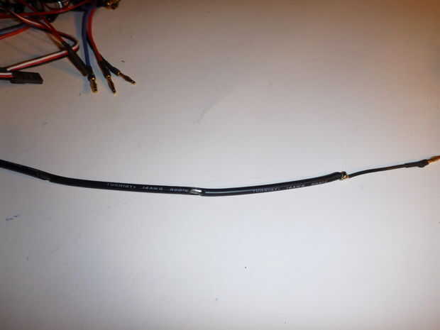 13. en el extremo corto de la el cable negro (el extremo que tiene la muesca del aislamiento removido 2,75" lejos), uno del negro 1,75" hilos que se cortan de los reguladores de velocidad y tubería del encogimiento del cubierta de la conexión con el calor de la soldadura.