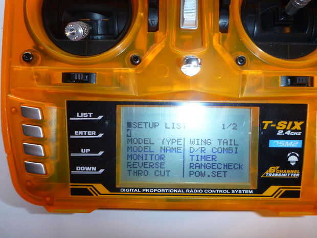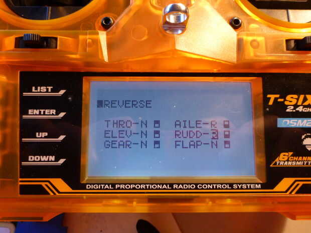 1. hay algunas cosas que necesitamos cambian en la radio. Encienda el transmisor y presione el botón de lista. Utilice la rueda de desplazamiento para desplazarse hacia "Atrás" y presione la rueda de desplazamiento para seleccionar. Desplácese hasta "AILE", haga clic en la rueda de desplazamiento para activar este elemento, desplácese hasta "R" (para atrás) y haga clic en la rueda de desplazamiento para seleccionar. Desplácese a "RUDD" y cambiarlo a "R" de la misma manera. El resto de los canales debe ser "N". Desplazarse a la línea de "◄" y haga clic en para volver al menú anterior.
