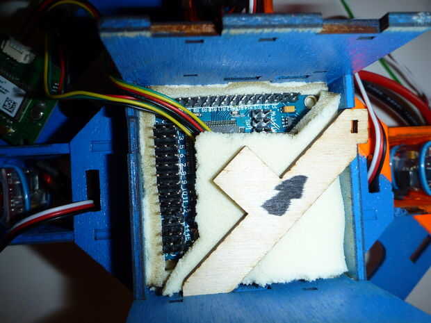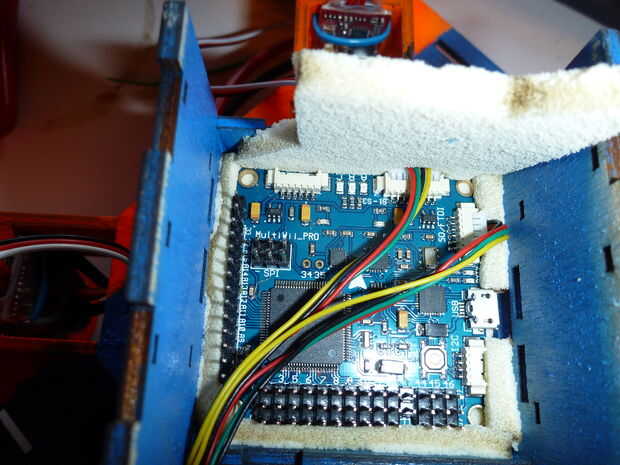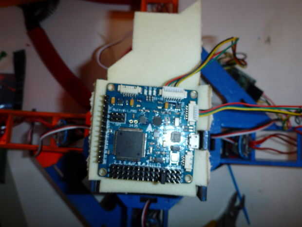 Puede seguir adelante y doblar la aleta triangular en la parte superior de la tarjeta controladora de vuelo e instale el travesaño como se muestra.
