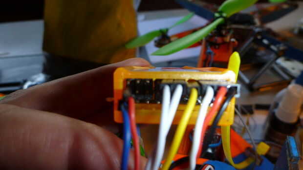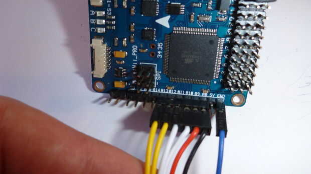 4. a continuación necesitamos conectar los cables de señal de receptor tierra a la a la tarjeta controladora de vuelo tal como se muestra. La tarjeta controladora de vuelo viene con un cable de servo de 3 pines y un montón de cables solo perno. Utilizaremos el cable de 3 pines para conectar los 3 primeros canales a lo FC y este solo uso 3 cables para conectar los 3 siguiente. Sólo nos estamos conectando los pines de señal para cada canal (con el receptor acostado, la fila superior de los pernos) al controlador de vuelo. Un 4 º cable de alambre se conectará a tierra. Alternativamente puede utilizar otro cable de servo de 3 clavijas en vez de los 3 cables individuales para hacer el cableado un poco limpiador.