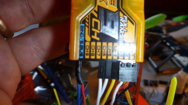 Nota: Si utiliza un receptor diferente, específicamente uno que los nombres de los pines (THROT, AILE, etc.) los canales podrían ser en un orden diferente. Si ese es el caso este no podrá utilizar el cable de 3 pines como es y tampoco tendrás que intercambiar pins en el conector de 3 pines o usar más de los cables solo perno.